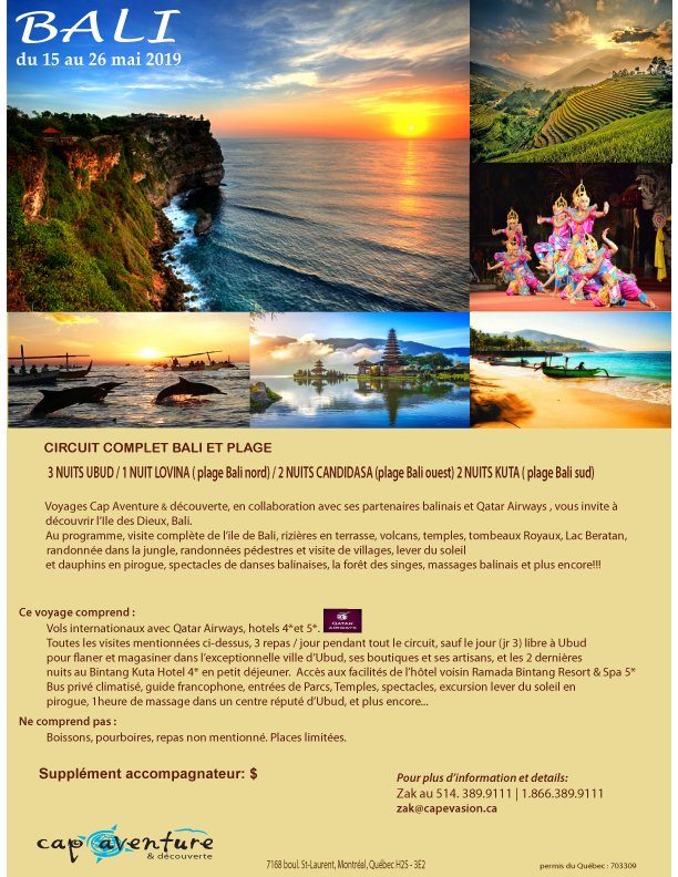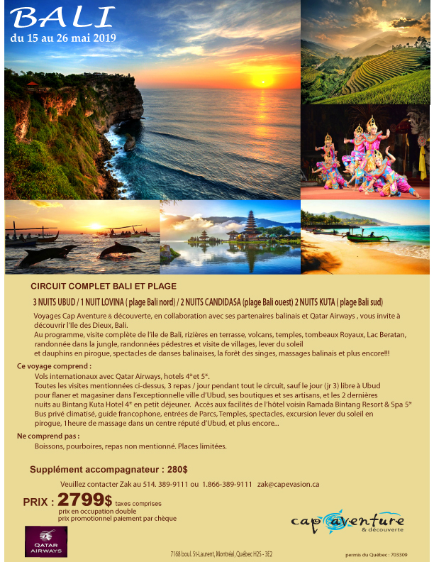 Bali, connue sous le nom Terre des Dieux, est un lieu unique et magique. Bali, la plus célèbre île de l’Indonésie, est un mélange fantastique de paysages montagneux spectaculaires, de belles plages de sable fin, de gens chaleureux et sympathiques, d’une culture vivante et de centres de villégiature de première classe. Bali vous enchante par sa beauté naturelle, qui inclut des volcans qui se dressent au loin et de fabuleuses rizières rayonnantes de paix et de sérénité. Cette île enchanteresse, avec ses danses spectaculaires, ses cérémonies colorées, ses artistes et artisans, ses luxueuses stations balnéaires et sa vie nocturne animée, a de quoi plaire à tous. Cette île exotique a beaucoup à offrir, de la spiritualité inspirante à la gastronomie, du surf de renommée mondiale et la plongée à d’exaltantes randonnées dans la jungle des montagnes sauvages. Vous trouverez de beaux temples finement sculptés, grands et petits, partout sur l’île, où ils servent comme centres de la vie spirituelle du peuple balinais. Le peuple de Bali est adepte de la région hindoue, il est fidèle et une grande partie de la vie de ses gens est dévouée à des rites et des cérémonies visant à maintenir l’harmonie dans ce monde. Il n’y a aucun doute que cette île relativement petite réserve bien des surprises. Bali étonne sans cesse les visiteurs locaux de même que les touristes internationaux venant de partout dans le monde. Les voyageurs du monde entier y viennent pour surfer sur les vagues de Kuta, Uluwatu et Dreamland, tandis que d’autres en profitent pour visiter et profiter de la beauté panoramique des montagnes et des lacs de Batur, Kintamani et Bedugul, et que d’autres y vont simplement pour magasiner ou pour passer d’interminables journées à la place. Il y a vraiment quelque chose pour tout le monde à Bali.
